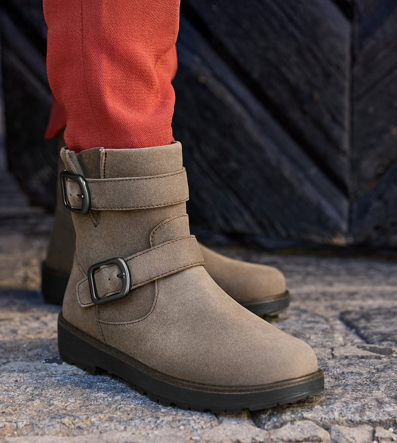 "I was recently diagnosed with foot arthritis and it was a huge bummer, because I work outdoors and am on my feet constantly, and taking long walks is also my favorite way to decompress. Walking has obviously become painful… but not in these boots! There’s the perfect amount of room for my toes in the wide toe box and the support of the shoe is amazing. These boots are the comfiest shoes I’ve ever owned, and even better, they are waterproof and are cute enough to be worn with a casual outfit and not just on a walk/hike! Thank you so much, Orthofeet!"