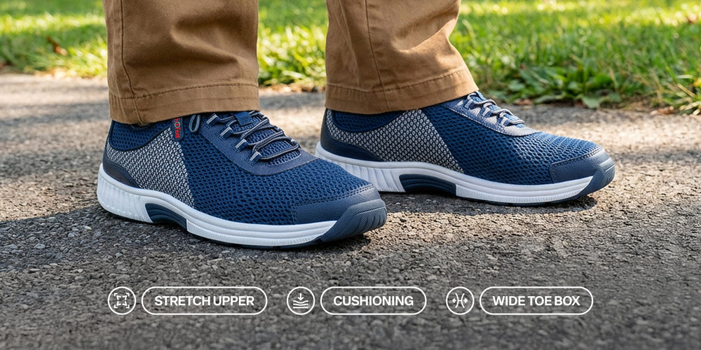 Foot swelling doesn't follow a predictable schedule. For most men dealing with edema, feet are at their smallest in the morning and their largest by late afternoon or evening, and the gap between those two states can be significant. A standard shoe built for a fixed foot size is, by definition, wrong for at least part of the day. Either it fits the morning foot and becomes painfully constricting by afternoon, or it fits the swollen foot and leaves the morning foot sliding and unstable. Orthofeet's shoes for swollen feet are built around a different premise entirely: a shoe that adjusts with your foot, not against it.