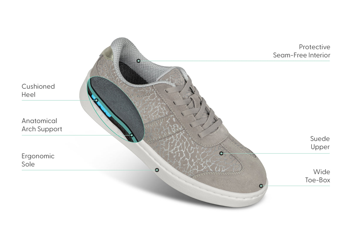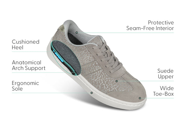 - Generously wide shoe silhouette to accommodate significant foot swelling as well as misshapen toes.