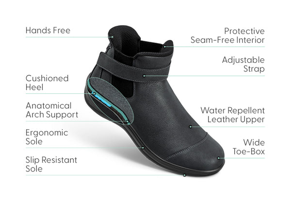 Slip-on Blaire boots with water-repellent leather and adjustable side strap. Our patented hands-free design lets you securely slide this Blaire boot on/off without bending, plus a side strap to sets your ideal fit. Soft, water-repellent leather and Blaire’s gore panel effortlessly move with you. The Ortho-Cushion™ System and a no-slip tread makes every step easy and low impact, hour after hour.