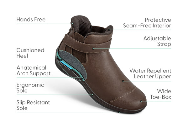 Slip-on Blaire boots with water-repellent leather and adjustable side strap. Our patented hands-free design lets you securely slide this Blaire boot on/off without bending, plus a side strap to sets your ideal fit. Soft, water-repellent leather and Blaire’s gore panel effortlessly move with you. The Ortho-Cushion™ System and a no-slip tread makes every step easy and low impact, hour after hour.