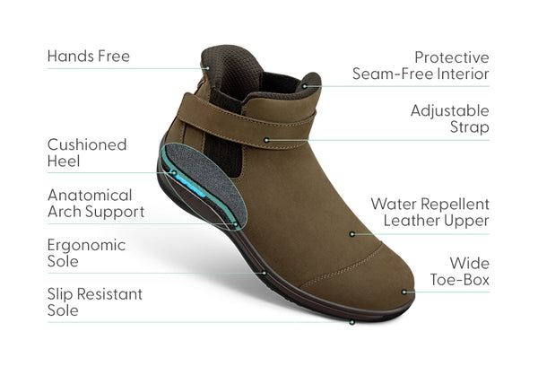 Slip-on Blaire boots with water-repellent leather and adjustable side strap. Our patented hands-free design lets you securely slide this Blaire boot on/off without bending, plus a side strap to sets your ideal fit. Soft, water-repellent leather and Blaire’s gore panel effortlessly move with you. The Ortho-Cushion™ System and a no-slip tread makes every step easy and low impact, hour after hour.
