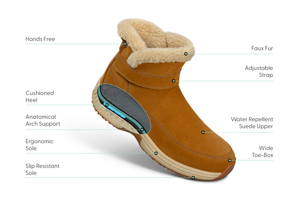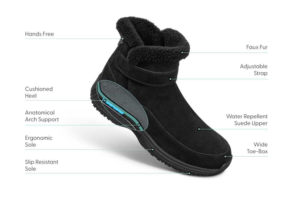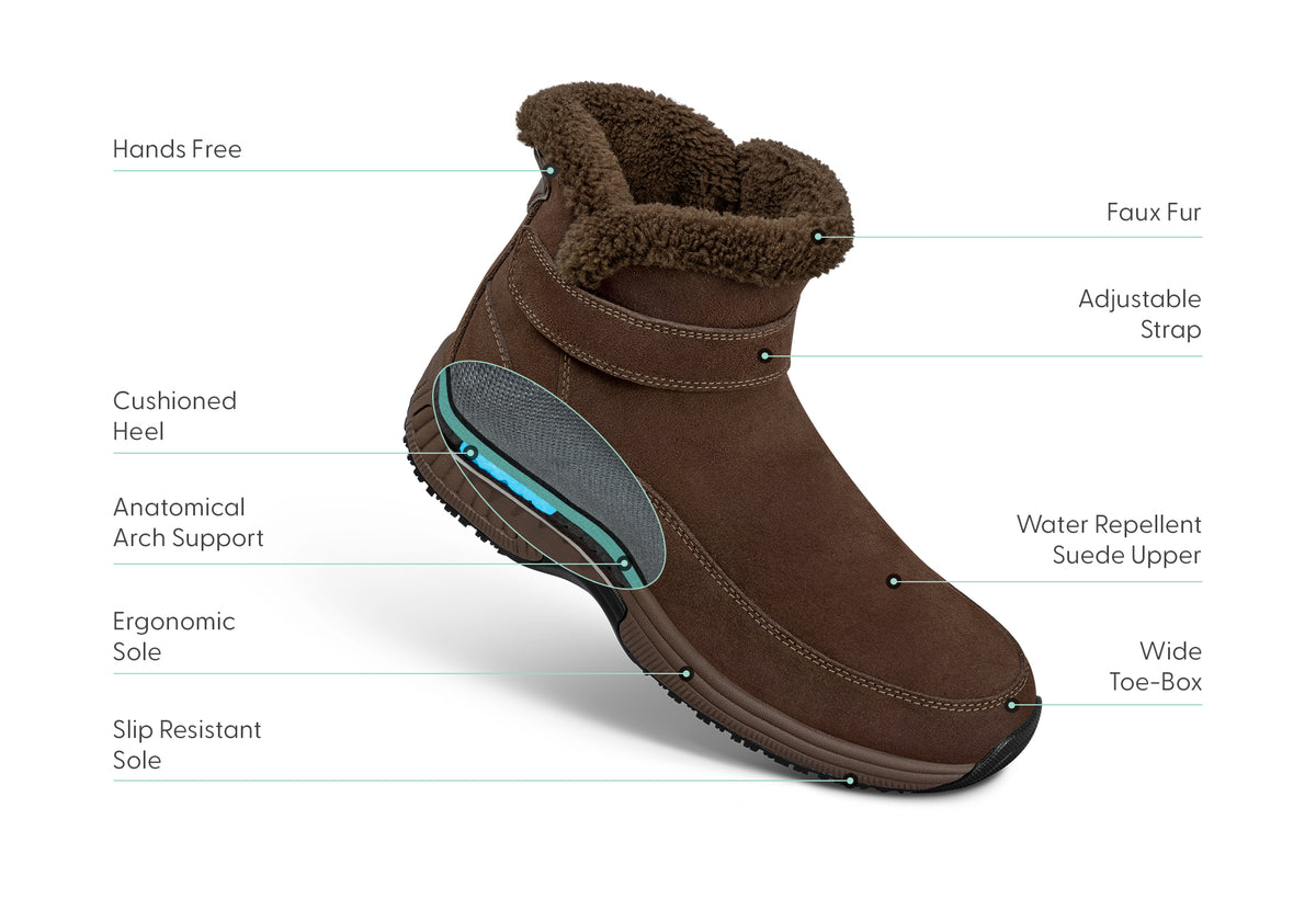 Stay warm, pain free and look great to boot! Just slide in and go, with our unique hands-free tech. Cold weather won't slow you down either, in water-repellent suede, no-slip traction tread and faux fur lining.