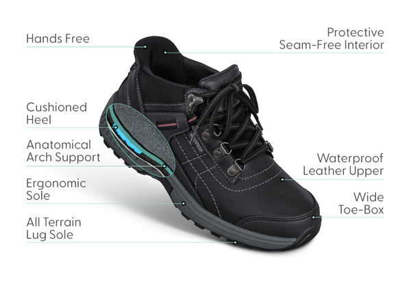 Waterproof hiking boots featuring patented slip-on design and therapeutic cushioning.