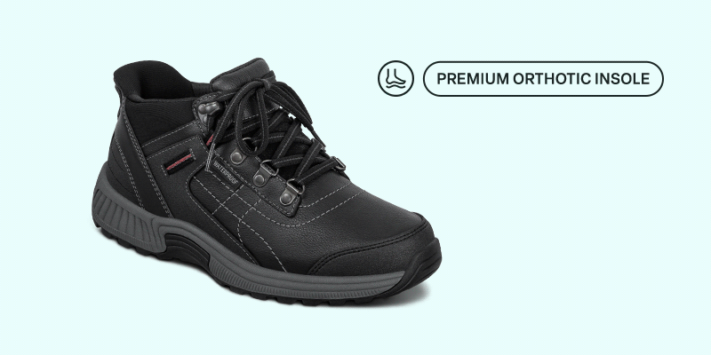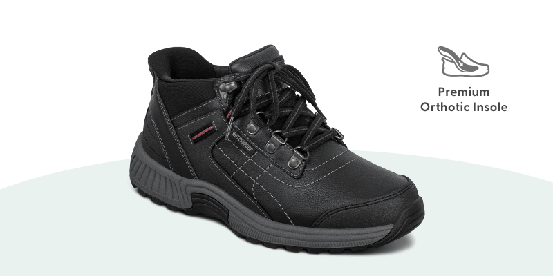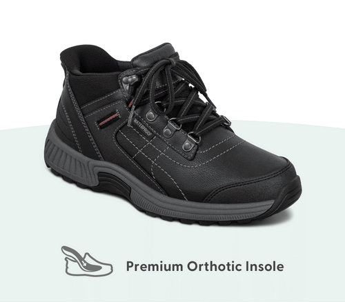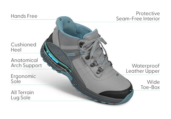 Waterproof hiking boots featuring patented slip-on design and therapeutic cushioning.