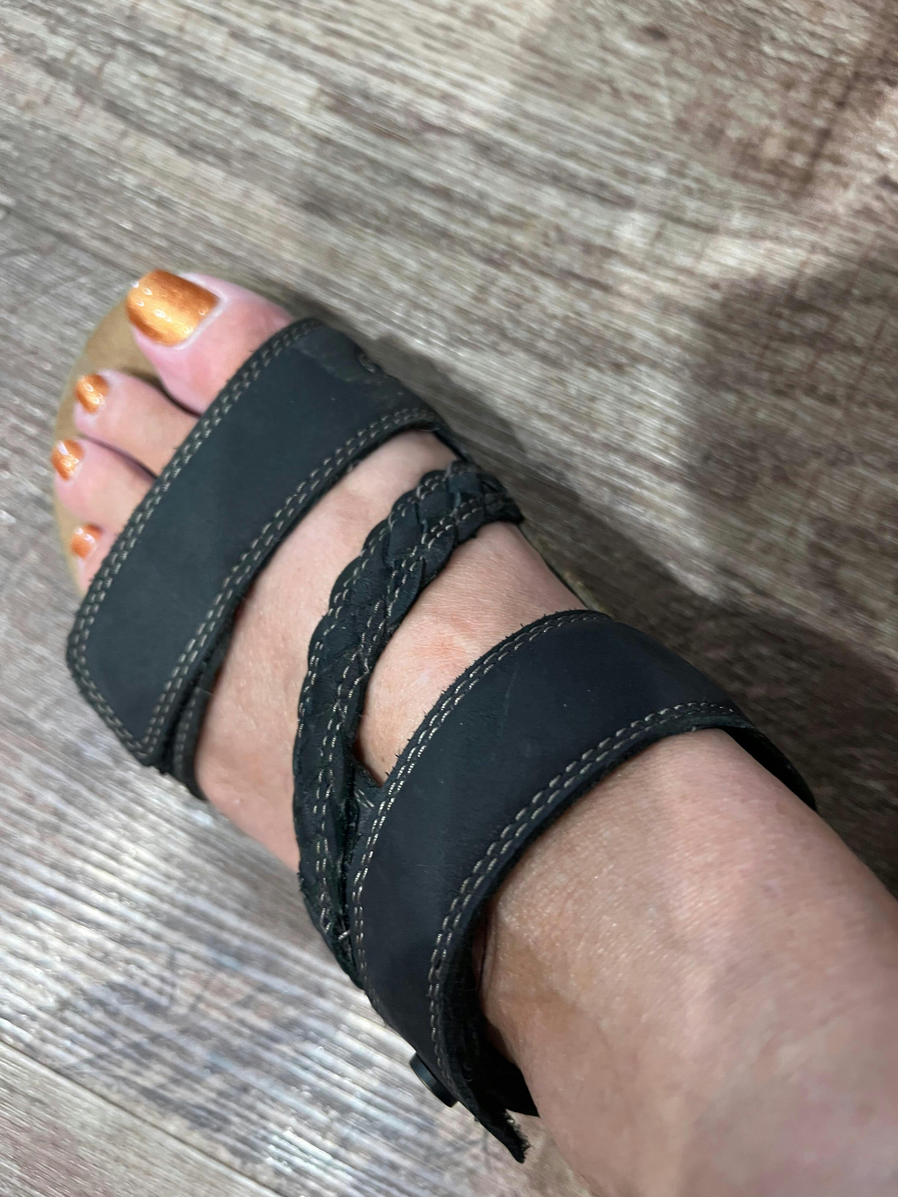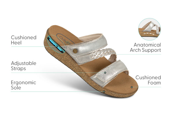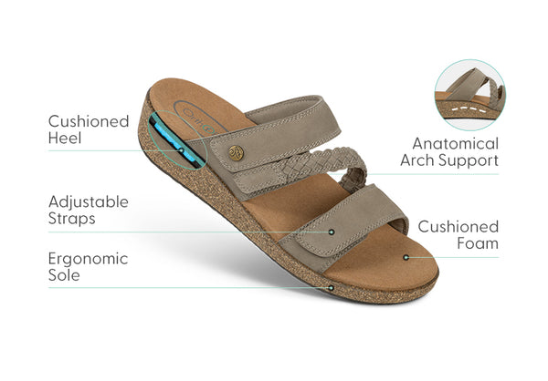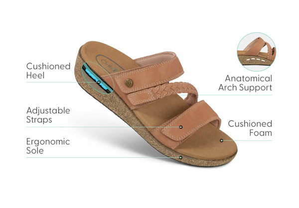 The natural, lightweight qualities of cork meet healthy Ortho-Cushion™ System ergonomics and support, for a beautiful slide sandal that optimizes pain-free walking. It couldn't be easier to tune your ideal fit & all three adjustable leather straps pull open, even the braided accent strap, and each is padded to keep sensitive feet free of pain, for longer sunny days.