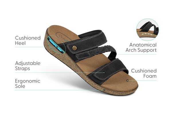 The natural, lightweight qualities of cork meet healthy Ortho-Cushion™ System ergonomics and support, for a beautiful slide sandal that optimizes pain-free walking. It couldn't be easier to tune your ideal fit & all three adjustable leather straps pull open, even the braided accent strap, and each is padded to keep sensitive feet free of pain, for longer sunny days.