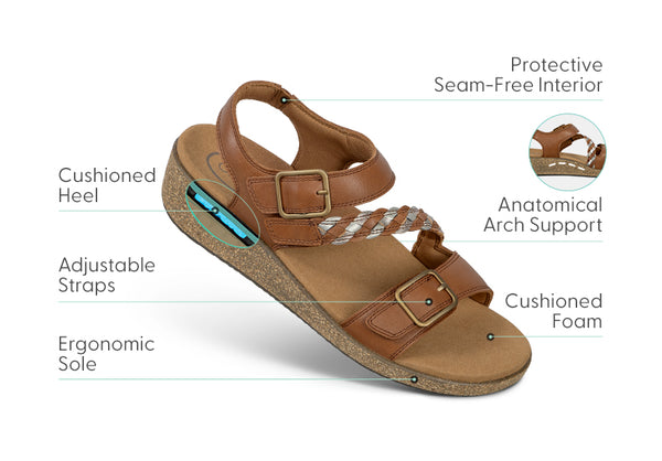Wrap your feet in the ultimate healthy support and pain-relief of advanced Orthofeet engineering, within the light and lovely benefits of a great-looking cork sandal. Appointed with buckle and braided accents, these three leather straps simply pull open, adjusting to every shape of your foot just as easily. Don't just look amazing, feel your best all day in Chloe.