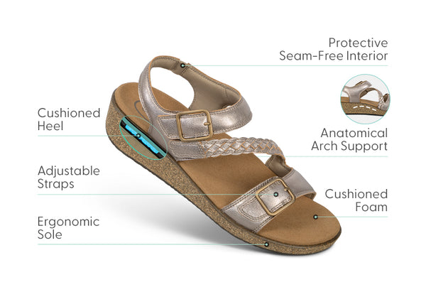 Wrap your feet in the ultimate healthy support and pain-relief of advanced Orthofeet engineering, within the light and lovely benefits of a great-looking cork sandal. Appointed with buckle and braided accents, these three leather straps simply pull open, adjusting to every shape of your foot just as easily. Don't just look amazing, feel your best all day in Chloe.