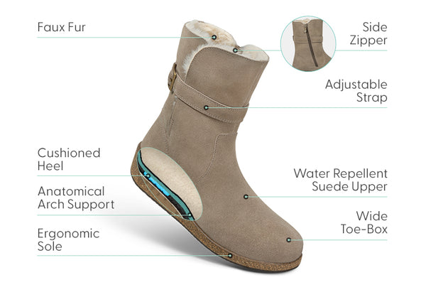 Treat your feet and ankles to cozy comfort and customizable support. With an adjustable strap and side zipper and a tongue that fully opens, these water-repellent suede boots are easy to get into. And they make sensitive feet happy with a faux fur-lined interior, even the insole. Don't miss a minute of the season, with the adjustable Ortho-Cushion™ System for pressure-free walking.