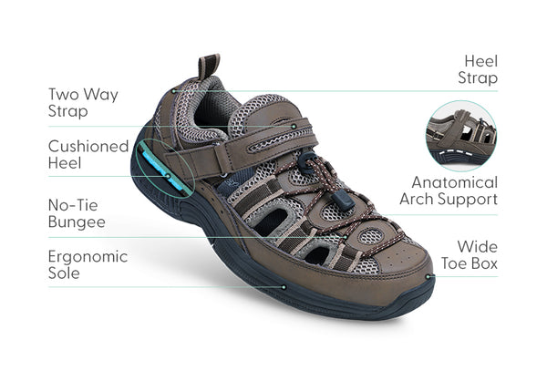 Explore your world in the Clearwater, a versatile, lightweight sandal ready to keep your foot cool and protected, with a closed-toe leather upper and the support and comfort of the Ortho-Cushion™ System. The two-way inset strap opens and adjusts on both sides for easy on & off, while the no-tie bungee closure and adjustable heel strap make a pressure-free fit easy.