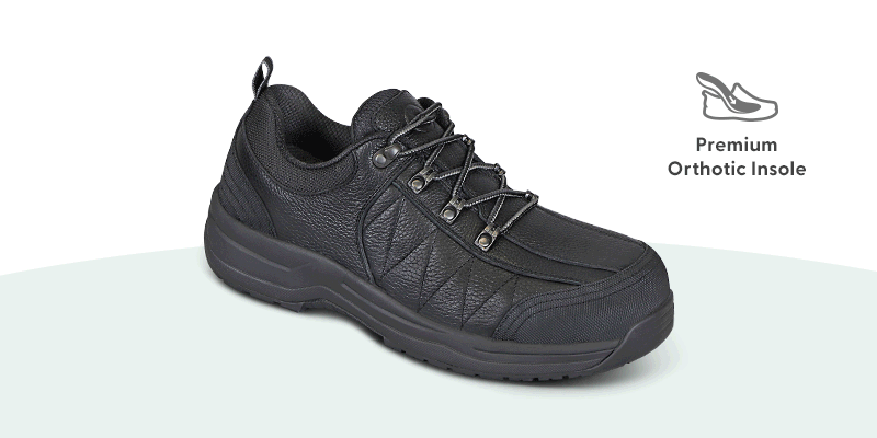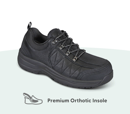Keep long workdays pain-free in these high-performance, safety-rated work shoes, with advanced Ortho-Cushion™ System support and comfort. A fully padded soft interior, extra depth and roomy toe box protect your mobility, while a crush-resistant, waterproof leather upper, composite toe guard and more protect you and your feet from workplace hazards.