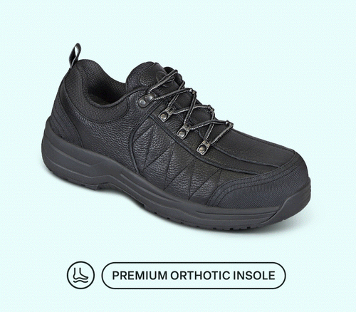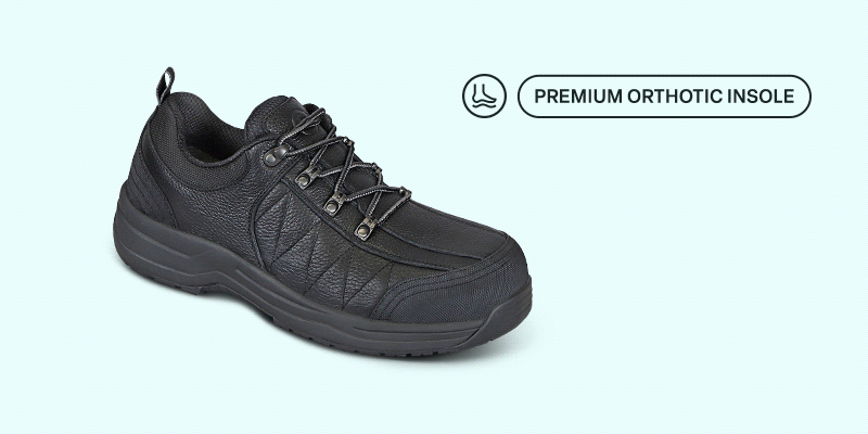 Keep long workdays pain-free in these high-performance, safety-rated work shoes, with advanced Ortho-Cushion™ System support and comfort. A fully padded soft interior, extra depth and roomy toe box protect your mobility, while a crush-resistant, waterproof leather upper, composite toe guard and more protect you and your feet from workplace hazards.