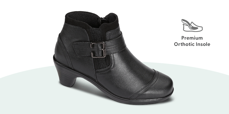 A stylish leather boot with a two-inch Bioheels™ offers the walking comfort of a sneaker and then some! Emma makes the impossible look easy, with Ortho-Cushion™ System support that evenly distributes foot pressure and a roomy toe box to keep every hour pain-free. A zipper for getting in easily and an adjustable strap over stretch gore fit your every move.
