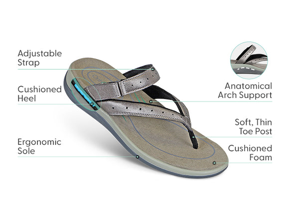 Fun summer flip flops just got a whole lot more comfortable with Gaya's unique features, from an irritation-free soft fabric toe post to the full-length support of our easy walking Ortho-Cushion™ System sole. The clever two-way inset strap can be opened, closed and adjusted on either side for an airy sandal that's as easy to take on and off as it is to keep on your feet all day.