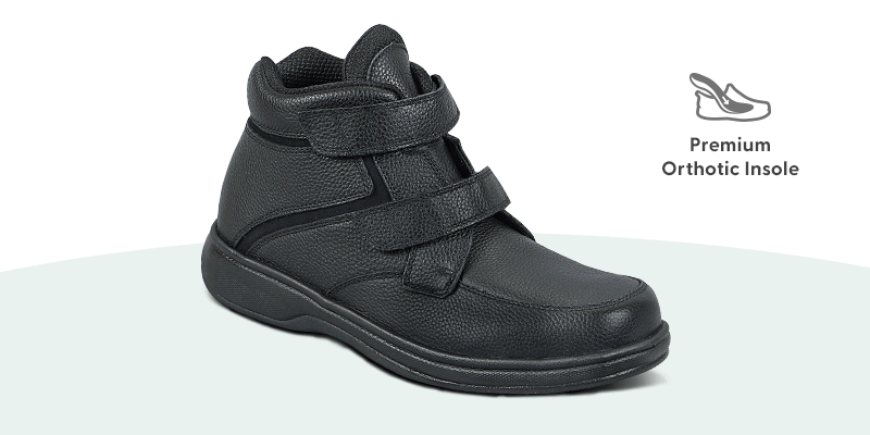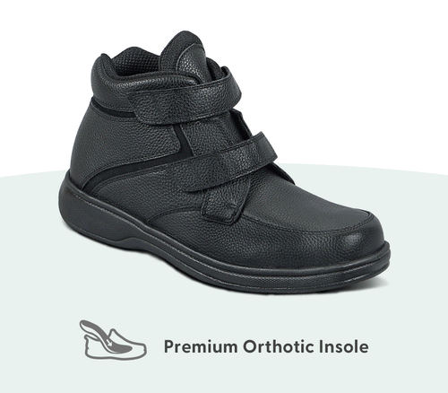 This boot takes functionality and comfort seriously, with a durable leather upper that supports ankles and looks good doing it. Swollen or sensitive feet? It doesn't matter, getting in is easy, with two adjustable straps and a tongue that all open. A wide toe box and extra depth ensure a pressure-free fit and adjustable Ortho-Cushion™ System support makes every step soft and stable.