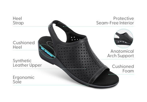 Whether you dress them up or down, our revolutionary wedge-style sandals deliver advanced Orthofeet cushioning and ergonomic engineering to prevent pain and support every healthy step. Just open Hazel's adjustable, padded heel strap and slide into stylish and soft perforated leather uppers that let your feet breathe and move, without irritation or binding.