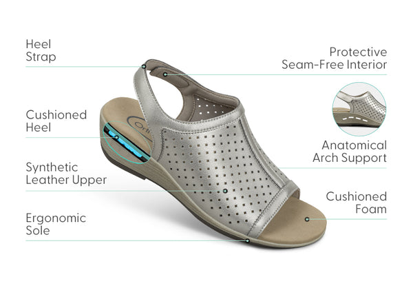 Whether you dress them up or down, our revolutionary wedge-style sandals deliver advanced Orthofeet cushioning and ergonomic engineering to prevent pain and support every healthy step. Just open Hazel's adjustable, padded heel strap and slide into stylish and soft perforated leather uppers that let your feet breathe and move, without irritation or binding.