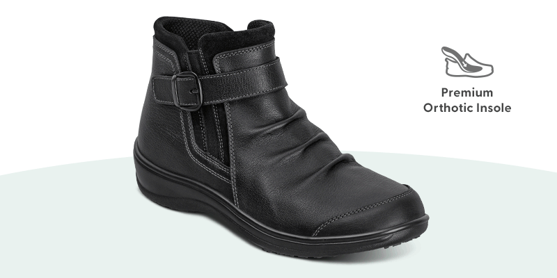 While an ultra-soft, "ruched" leather upper charms with its versatile style, innovative Orthofeet features make Heidi a go-to bootie for getting more out of your day. Use the zipper on the inner side for remarkably easy on & off. The adjustable buckle, over stretch gore on the outer side, adds comfort that moves with you. Step out confidently with the Ortho-Cushion™ System.