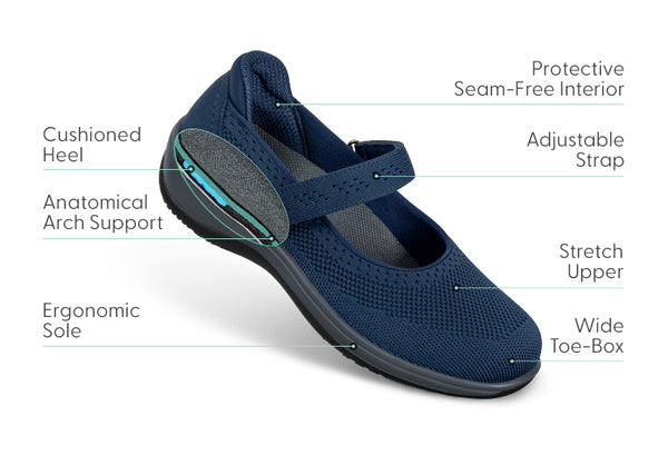 This light and lithe Mary Jane is easy to slip on and the adjustable inset strap also opens, for more ways to customize your fit and get moving. Jessa’s relaxed, breathable stretch upper follows every shape of your feet and a roomy, soft interior protects sensitive areas. Walk happier with the heel-to-toe comfort and adjustable support of Ortho-Cushion™ System.