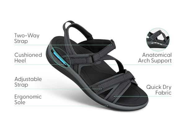 Keep every splash pain-free in these high-performance water friendly sandals, with three quick-dry, padded straps. The inset strap opens for easy on & off and adjusts on both sides, the forefoot strap adjusts too & for the perfect, secure fit. A grippy tread and supportive Ortho-Cushion™ System outsole protects every step and reduce walking impacts from heel to toe.