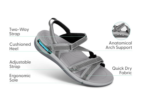 Keep every splash pain-free in these high-performance water friendly sandals, with three quick-dry, padded straps. The inset strap opens for easy on & off and adjusts on both sides, the forefoot strap adjusts too & for the perfect, secure fit. A grippy tread and supportive Ortho-Cushion™ System outsole protects every step and reduce walking impacts from heel to toe.