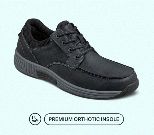 With knockabout good looks and a durable, flexible leather upper, Leo defends your walking comfort everywhere you go. A roomy, padded interior with adjustable depth and anatomical arch support provides customizable, irritation-free support. The cushioned Ortho-Cushion™ System insole, mild rocker design, and high-traction outsole take pressure off pain points and stabilize every step.