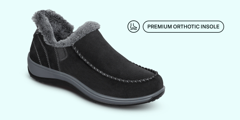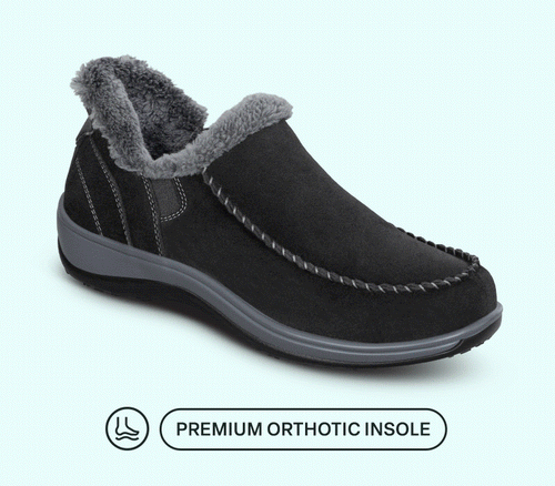 Saunter indoors and venture out in the luxurious comfort of these suede slipper-shoes. No need to bend down, our revolutionary hands-free technology makes it easy to slide them on and get going. Lined with cozy faux fur, Lorin keeps feet warm and free of irritation for pain-free hours anywhere, featuring the walking support of the Ortho-Cushion™ System to soften every step.