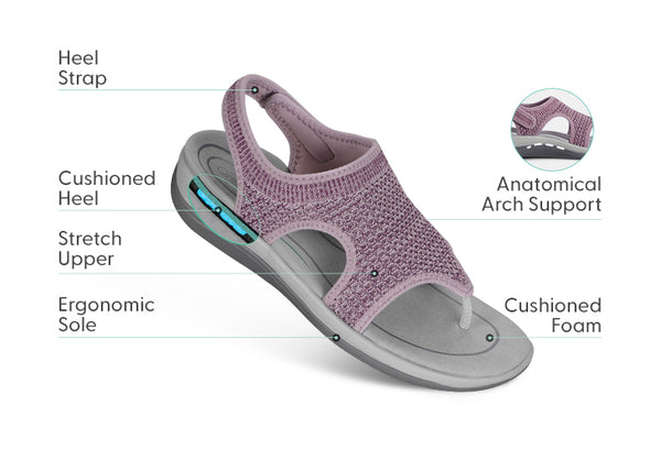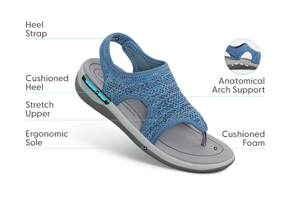 - This women's sandal gently hugs the curves of your foot in stretchable, breathable fabric. The toe-post is thin, soft and flat for irritation-free comfort and the padded heel strap makes it easy to slide on and enjoy a flip-flip alternative that won't slip off. How cool is that? Our Ortho-Cushion™ System is the ideal platform to keep your busy summer days blissfully pain-free.