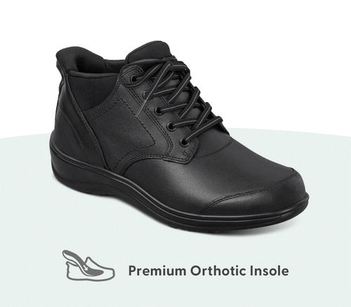Leather boots featuring patented slip-on design and therapeutic cushioning.