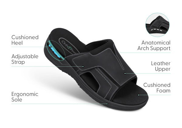 Handsome and cool, this leather slide sandal welcomes healthy comfort to the warm weather. With its soft protective interior, the fully openable forefoot strap area is adjustable for a secure, pressure-free fit. Sarasota takes pain out of every step with advanced Ortho-Cushion™ System engineering, including our adjustable anatomical arch support and easy-walking sole.