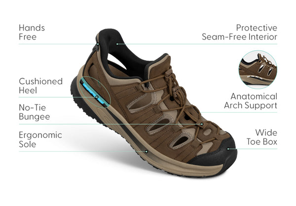 Slip into out-of-this-world ventilated walking comfort. Saturn features our patented hands-free design in a closed-toe leather sandal. Set your custom fit with two bungee laces per foot. Then take the scenic route with a stable, max cushion sole and heel-to-toe Ortho-Cushion™ System pain-relief. A rubber sole enhances traction on a variety of surfaces.