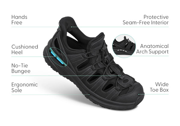 Slip into out-of-this-world ventilated walking comfort. Saturn features our patented hands-free design in a closed-toe leather sandal. Set your custom fit with two bungee laces per foot. Then take the scenic route with a stable, max cushion sole and heel-to-toe Ortho-Cushion™ System pain-relief. A rubber sole enhances traction on a variety of surfaces.