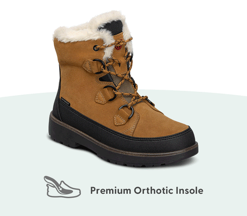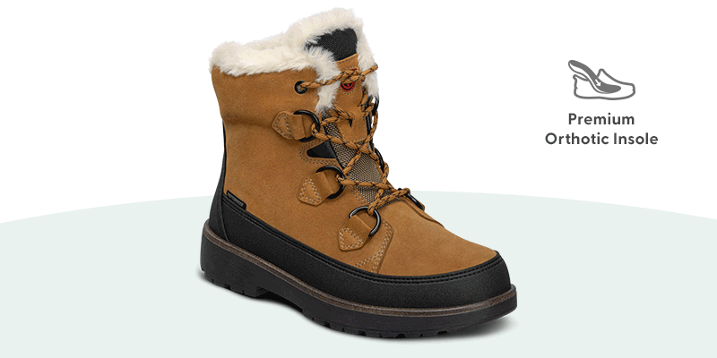 When it’s time to bundle up for the cold and snow, be perfectly dry, warm and comfortable in the waterproof suede Stowe. A gusseted tongue keeps the weather out while a side zipper closure makes it a breeze to put these boots on. Fur lined, even on the insole, for maximum coziness. Walk easy with the Ortho-Cushion™ System, a pressure-free fit, and lugged tread.