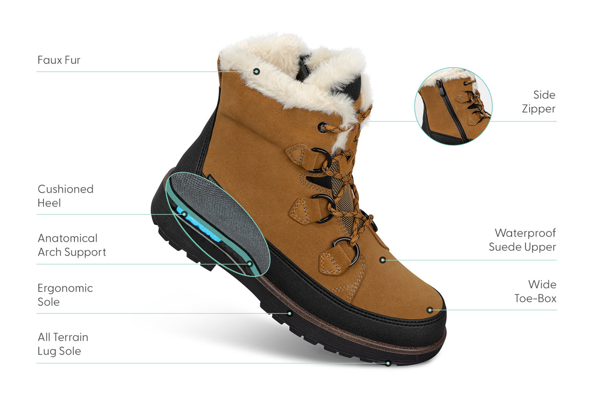 When it’s time to bundle up for the cold and snow, be perfectly dry, warm and comfortable in the waterproof suede Stowe. A gusseted tongue keeps the weather out while a side zipper closure makes it a breeze to put these boots on. Fur lined, even on the insole, for maximum coziness. Walk easy with the Ortho-Cushion™ System, a pressure-free fit, and lugged tread.