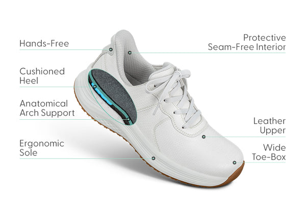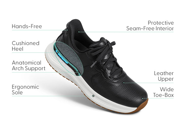 Essential athleisure style meets advanced technology for non-stop active comfort. Crafted in supple leather, Stride’s patented hands-free design means you can skip the laces – just slide-on and go! A roomy interior and wide toe box protect sensitive feet. Keep pain out of your way all day with a premium Orthofeet orthotic insole, max cushion sole and stable, grippy tread.