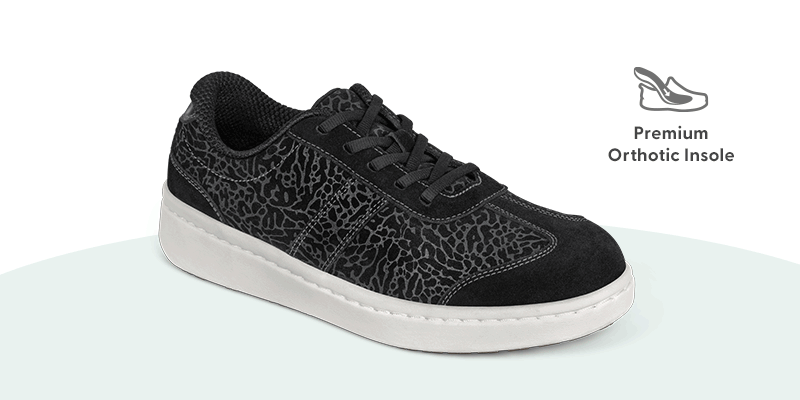 This up-to-date athleisure sneaker for women, in patterned suede leather, infuses classic sport styling with advanced therapeutic performance that addresses 20+ foot conditions. A padded interior with extra depth and wide toe box protects your mobility. With the bio-engineered support and comfort of the Ortho-Cushion™ System, it's game over for walking pain.