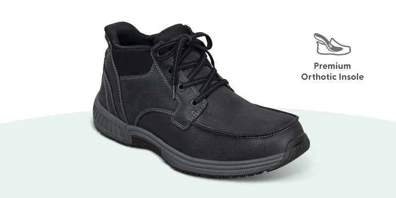 Leather boots featuring patented slip-on design and therapeutic cushioning.